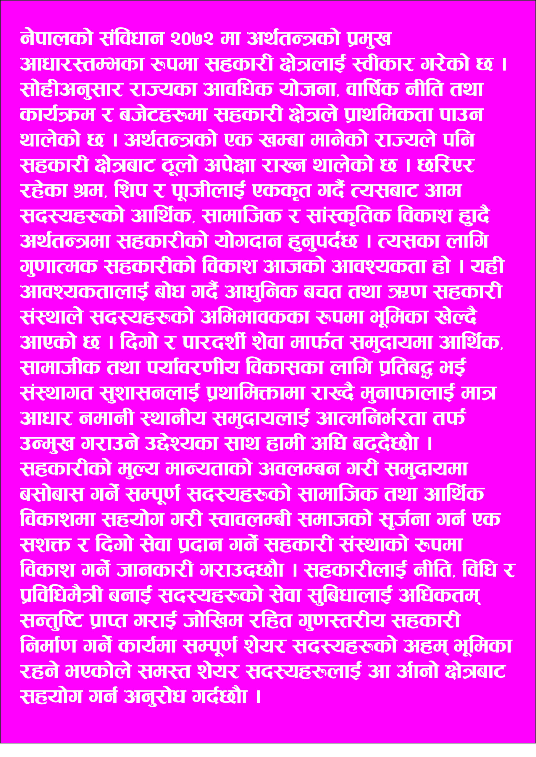 “सदय्स्यहरुसंग प्रगाड आत्मित्यता, जन्म देवी मृत्युसम्म साथको प्रतिबद्ता” मुलनाराका साथ देहायका कार्यक्रमहरु लागु गरिएको छ।