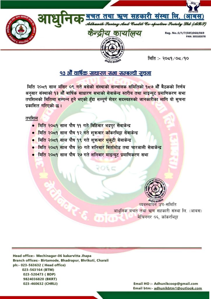 १३ औं बार्षिक साधारण सभा सम्बन्धी सूचना